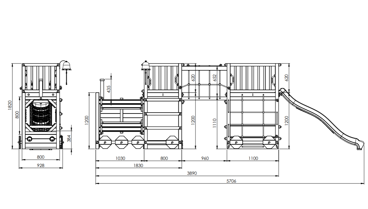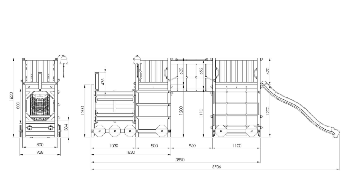 Den integrerede lokomotivtunnel skaber rammerne for rolleleg og temabaserede eventyr. Den 220 cm lange rutsjebane sikrer kontinuerlig bevægelse, mens klatretov, netbro og klatrenetvæg tilfører koordinerende og styrkebaserede udfordringer. Under platformen er der etableret picnicbord, som giver mulighed for ophold, kreative aktiviteter og pauser mellem leg.