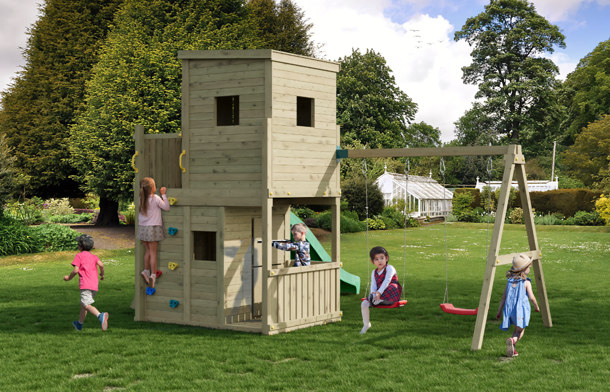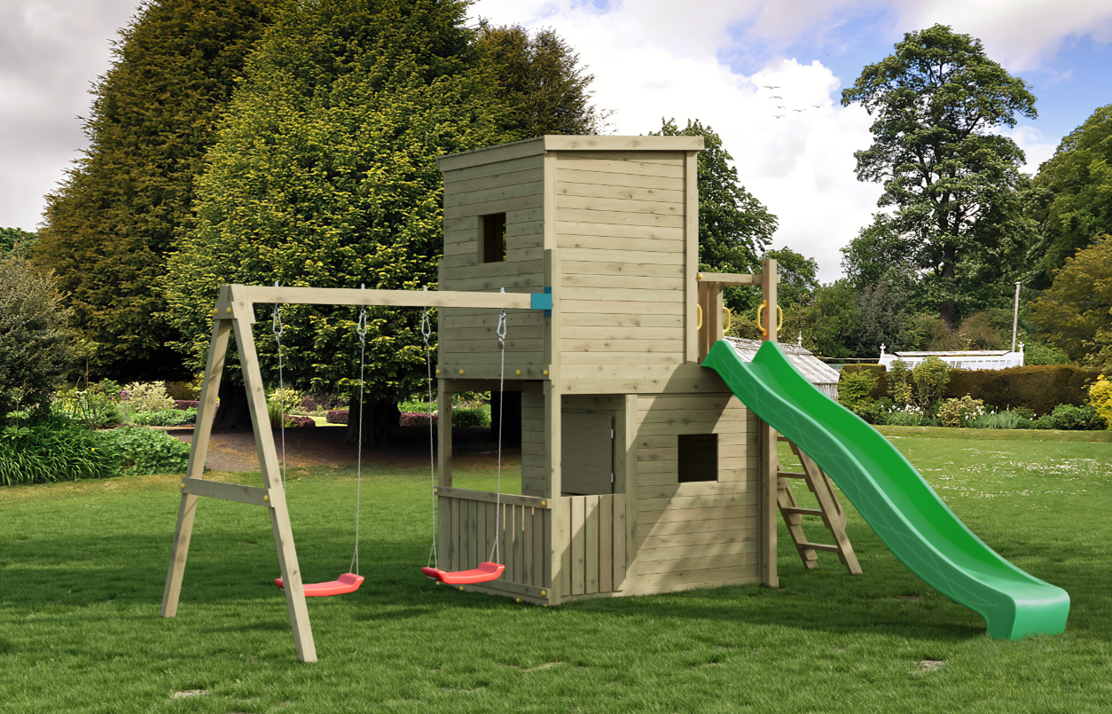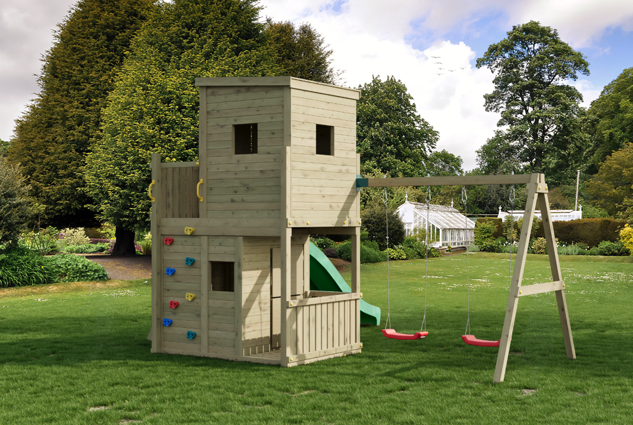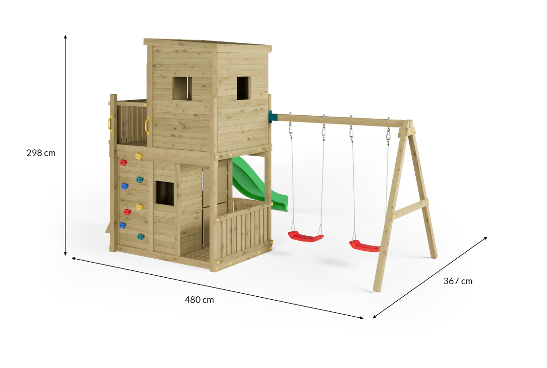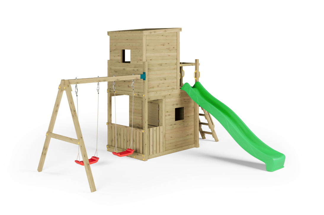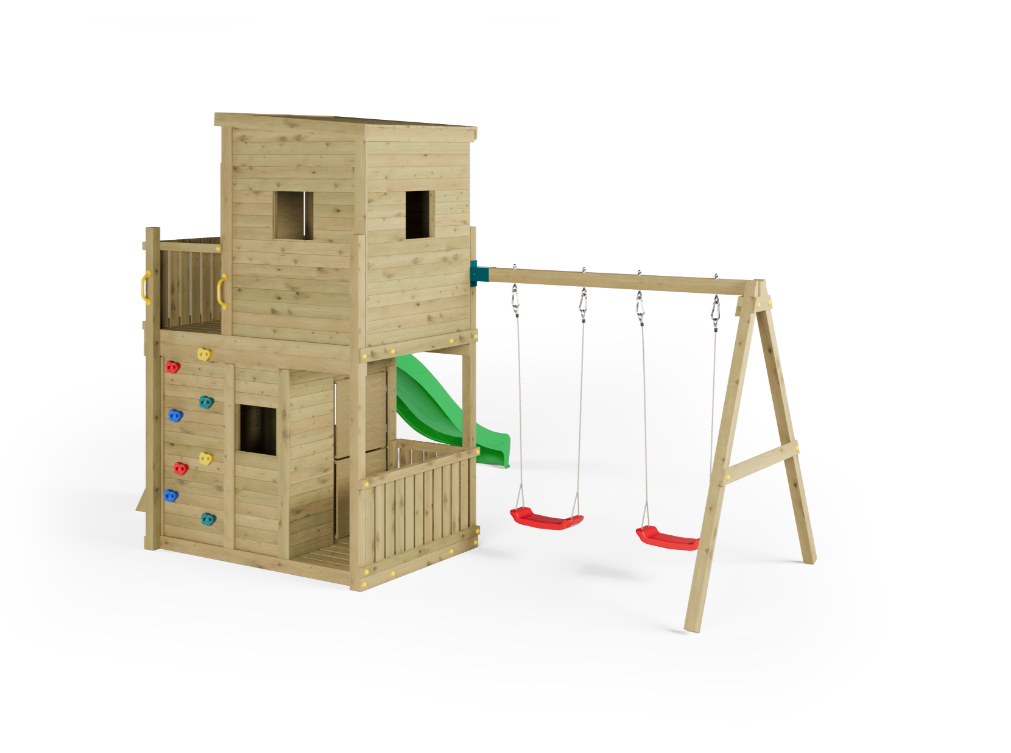 Opgrader haven med Lofter_2Swings – et komplet legesystem udviklet til aktiv udendørs leg og kreativ udfoldelse. Konstruktionen kombinerer rutsjebane, gynger, klatring og legehus i én samlet løsning og er dimensioneret til intensiv brug af flere børn samtidig.