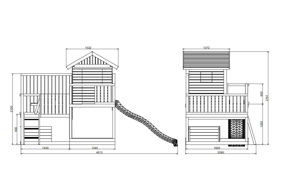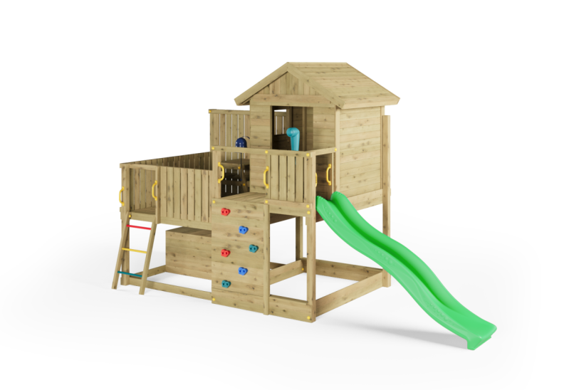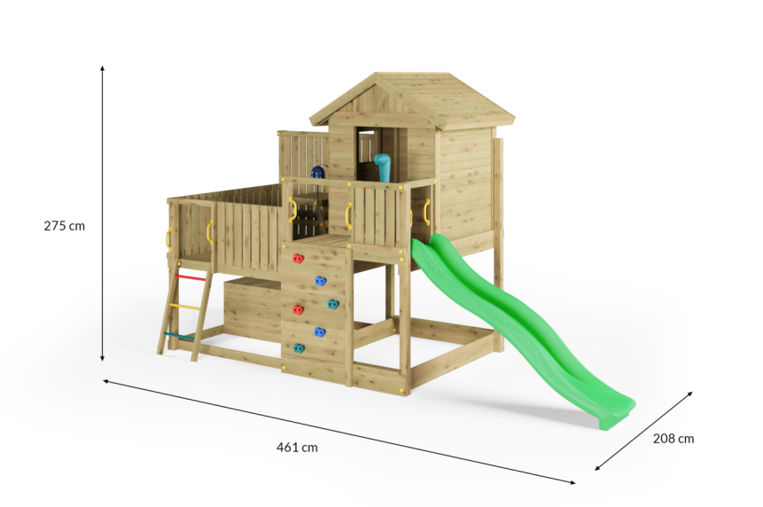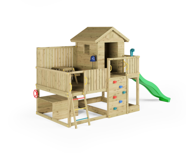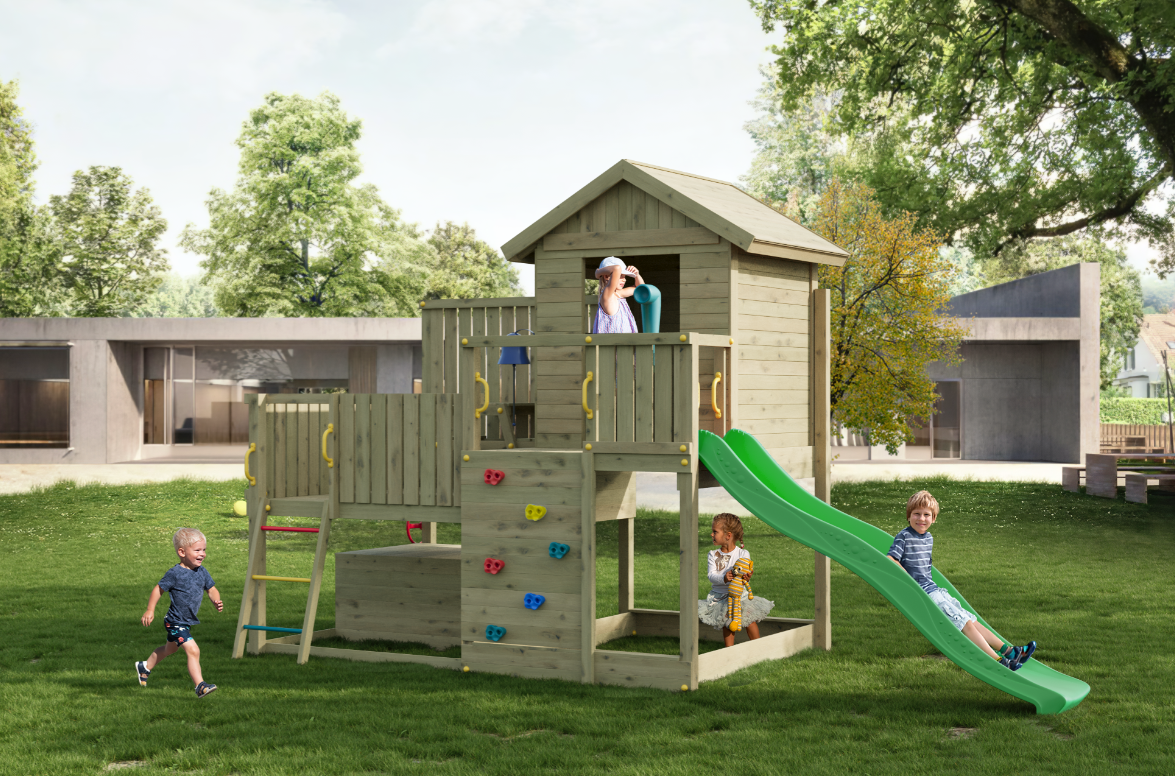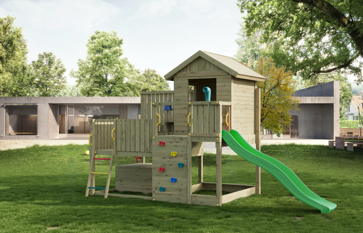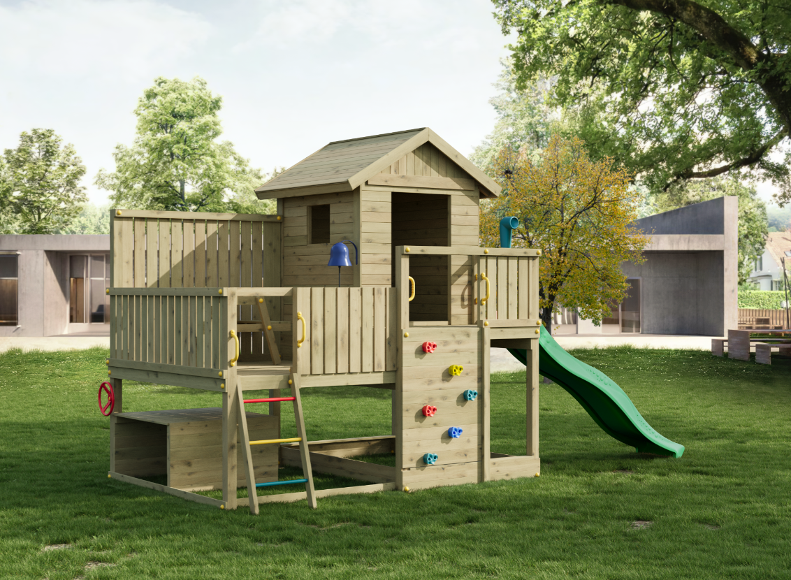 Den 220 cm lange rutsjebane giver en jævn og stabil nedkørsel, som motiverer til gentagen aktivitet. Legehuset med trætag fungerer som base for rolleleg og kreative scenarier, mens picnicbordet på terrassen og legebordet under platformen giver plads til ophold og fordybelse. Den integrerede sandkasse udvider mulighederne for kreativ leg.