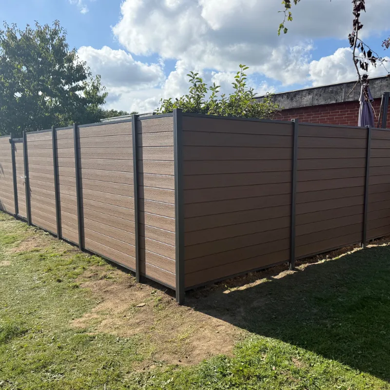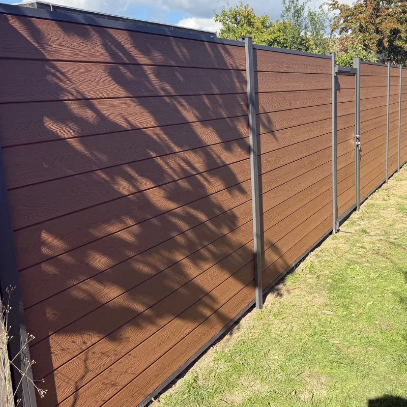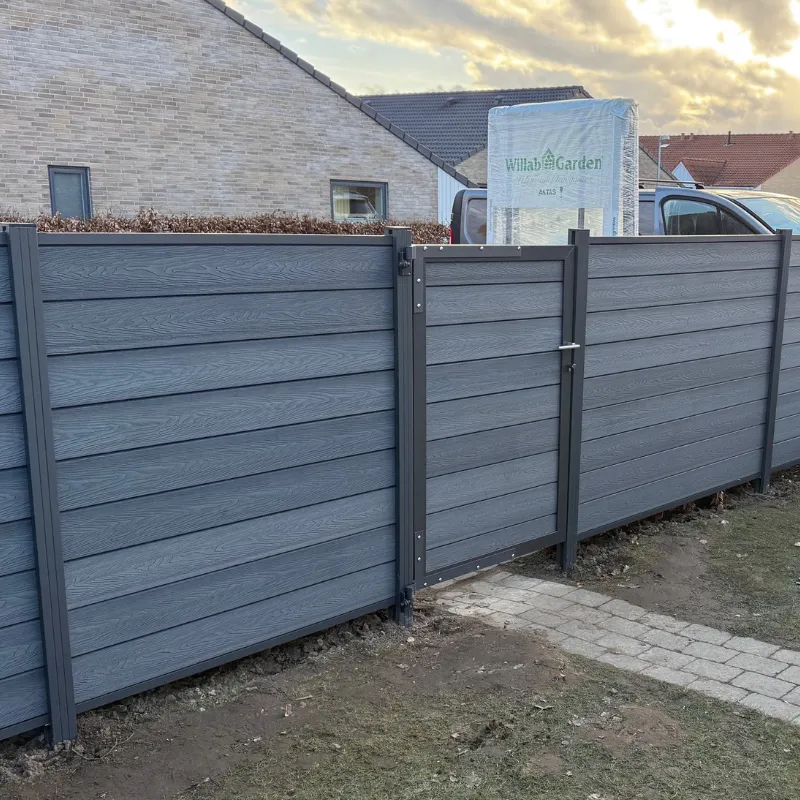 De stærke brædder og aluminiumsstolper sikrer et stabilt hegn, der bevarer sin form og farve år efter år.