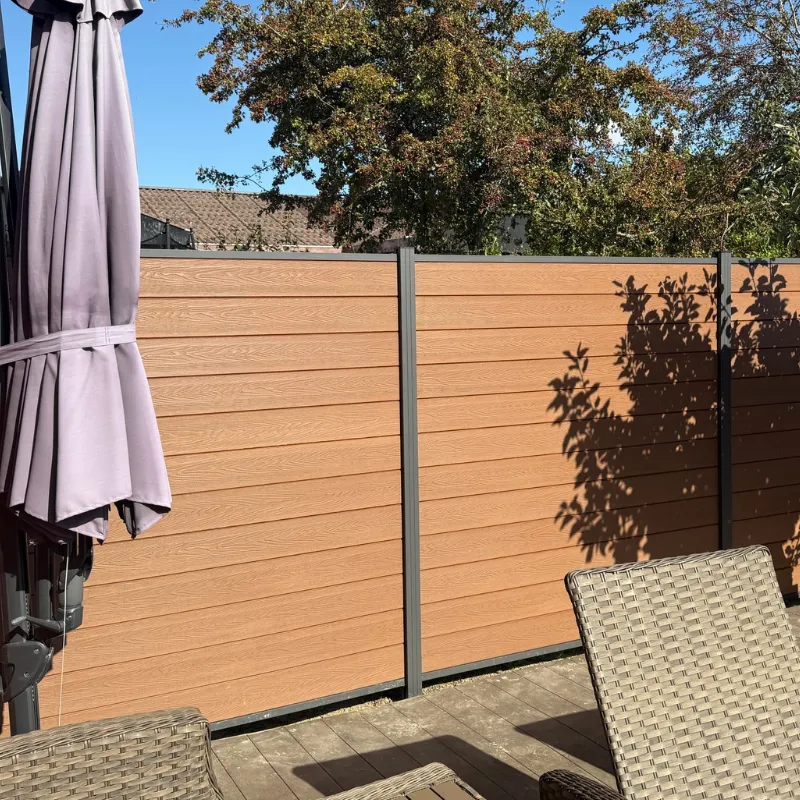 Nice komposithegn er fremstillet i solide, forstærkede brædder og monteres på pulverlakerede aluminiumsstolper i antracit, som giver maksimal stabilitet og et elegant, moderne look.