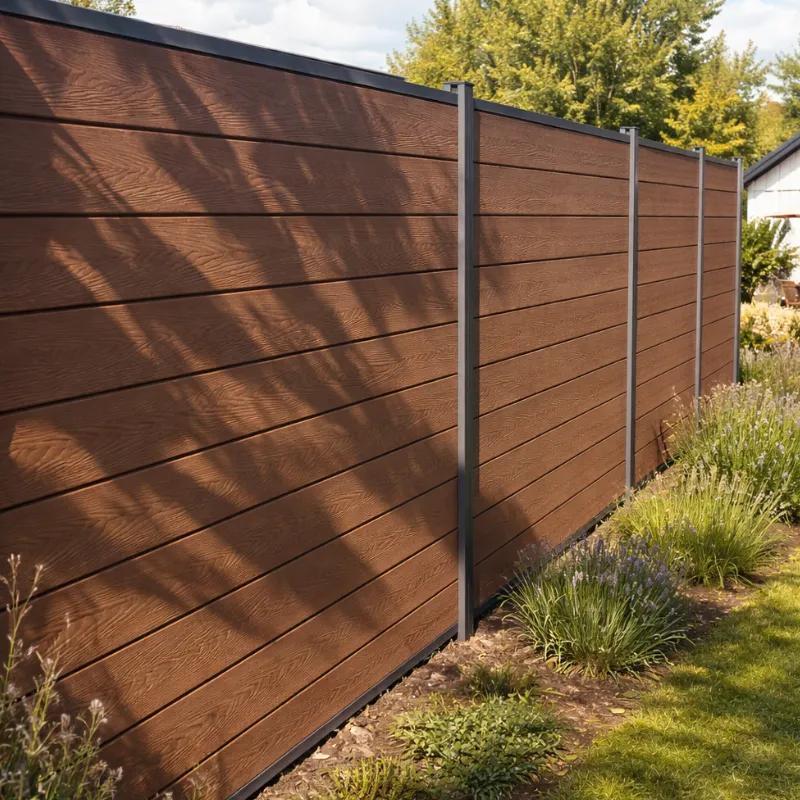 De kraftige kompositbrædder kombineret med pulverlakerede aluminiumsstolper i antracit giver et elegant og stabilt hegn med lang levetid og minimal vedligeholdelse.