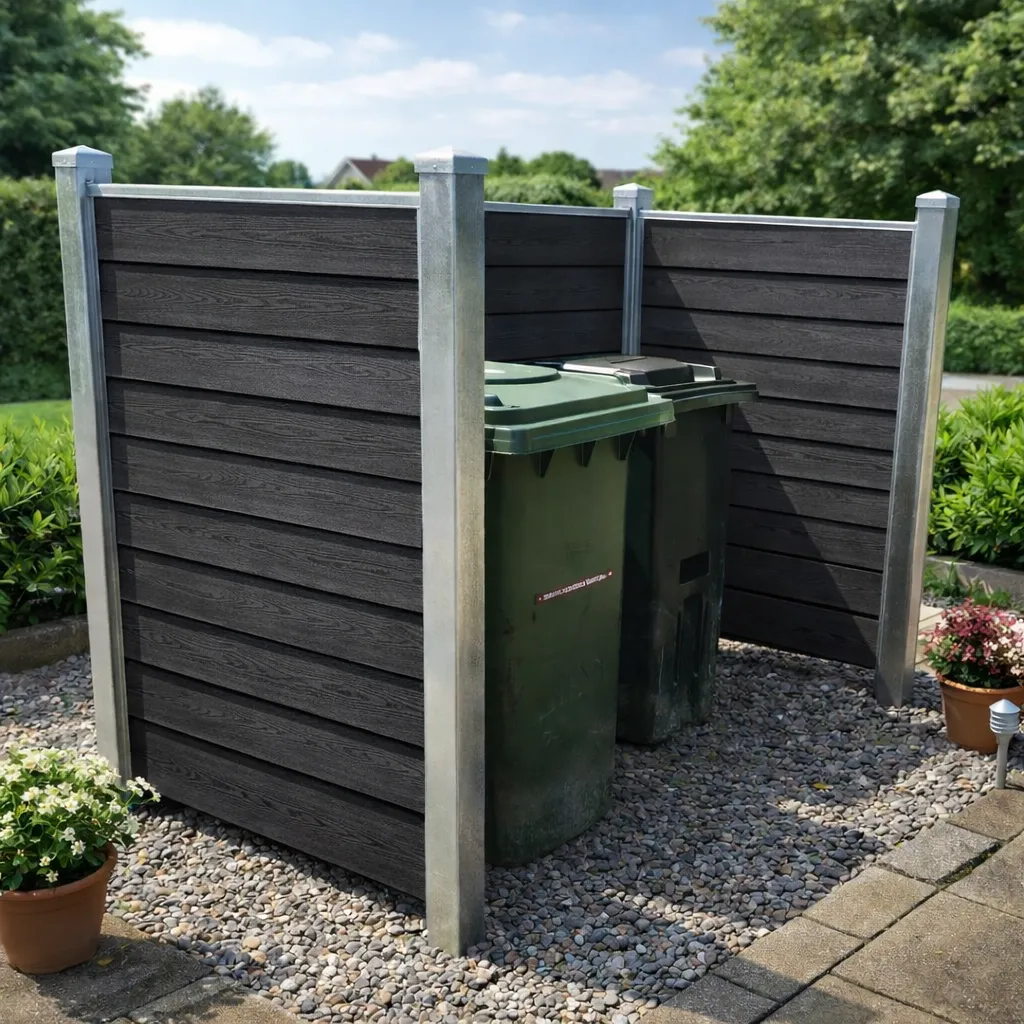 Skraldespandsskjuleren "model Stockholm" leveres med kompositbrædder, samt stålstolper til nedgravning hvilket giver en utrolig god stabilitet